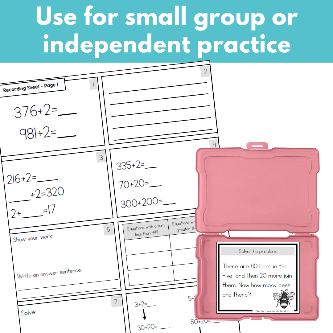 Get really strategic with addition instruction in your classroom this year with this set of task cards that encourage conceptual learning. In this set, the Plus Two facts with sums to 1,000 will be extended to the tens and hundreds. Students will use these task cards to practice this concept in a variety of different ways, including ten frames, missing addends, number lines, problem-solving, and more.