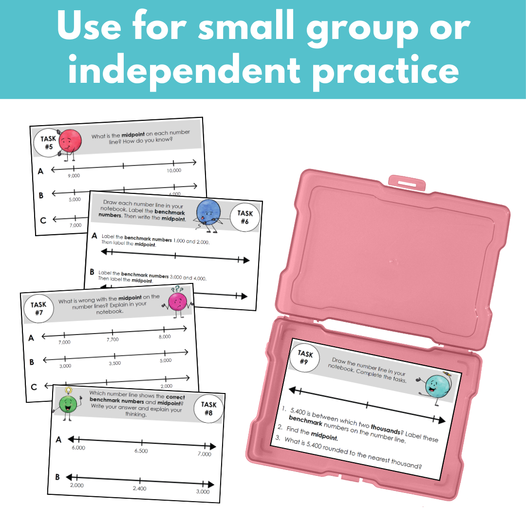 These task cards focus on a conceptual understanding of rounding and include skills such as using benchmark numbers and midpoints to round to the nearest thousand within 10,000. For each one, students will use their knowledge of rounding to the nearest thousand to complete the tasks.