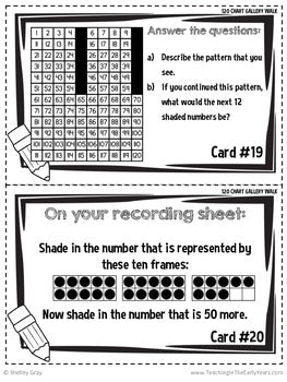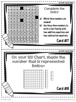 This gallery walk focuses on number skills within a 120 chart. The cards are designed to integrate other number sense skills such as skip counting, ordering numbers, more than/less than, number patterns, fact families, and more!